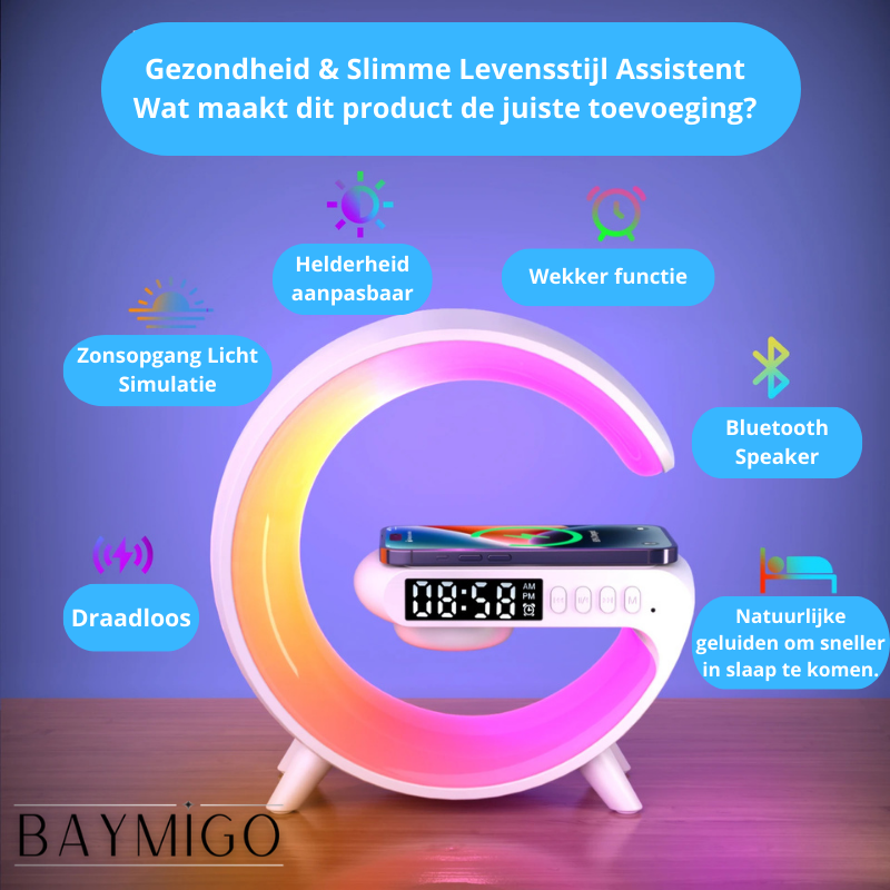Zeg vaarwel tegen harde alarmen. Ontwaak elke ochtend rustig en natuurlijk met een zachte zonsopgang die jouw kamer vult met een warme, gouden gloed. Het perfecte begin van een productieve dag.